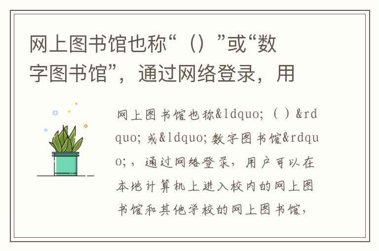 网上图书馆也称“()”或“数字图书馆”,通过网络登录,用户可以在本地计算机上进入校内的网上图书馆和其他学校的网上图书馆,在里面阅读、查询资料。 A. 现代图书馆 B. 电脑图书馆 C. 远程图书馆 D. 智能图书馆