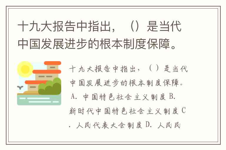 十九大报告中指出,()是当代中国发展进步的根本制度保障。 A. 中国特色社会主义制度 B. 新时代中国特色社会主义制度 C. 人民代表大会制度 D. 人民民主