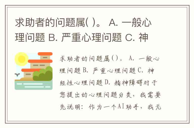 求助者的问题属( )。 A. 一般心理问题 B. 严重心理问题 C. 神经性心理问题 D. 精神障碍