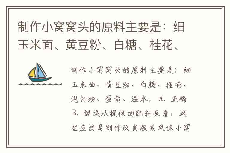 制作小窝窝头的原料主要是:细玉米面、黄豆粉、白糖、桂花、泡打粉、蛋黄、温水。 A. 正确 B. 错误