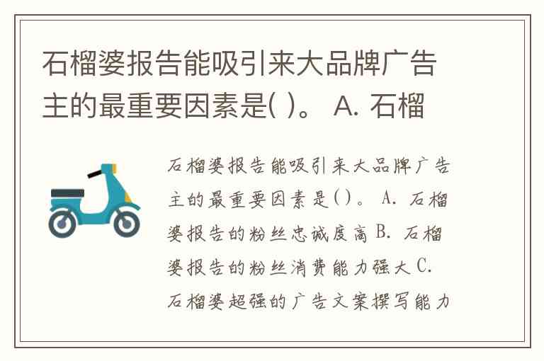 石榴婆报告能吸引来大品牌广告主的最重要因素是( )。 A. 石榴婆报告的粉丝忠诚度高 B. 石榴婆报告的粉丝消费能力强大 C. 石榴婆超强的广告文案撰写能力