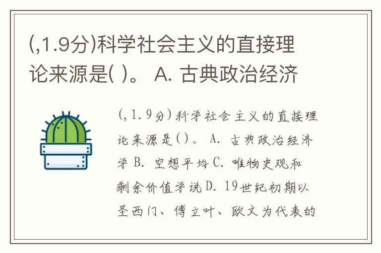 (,1.9分)科学社会主义的直接理论来源是( )。 A. 古典政治经济学 B. 空想平均 C. 唯物史观和剩余价值学说 D. 19世纪初期以圣西门、傅立叶、欧文为代表的空想社会主义