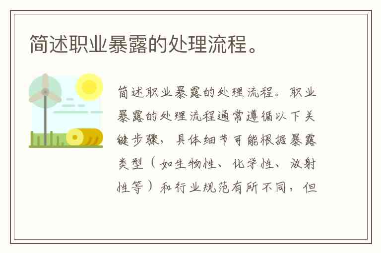 职业暴露的处理流程通常遵循以下关键步骤,具体细节可能根据暴露类型(如生物性、化学性、放射性等)和行业规范有所不同,但通用原则如下: