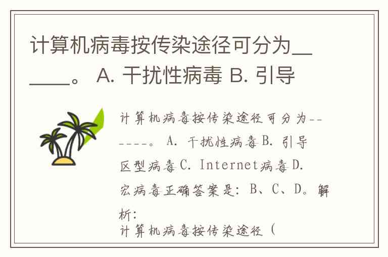 计算机病毒按传染途径可分为______。 A. 干扰性病毒 B. 引导区型病毒 C. Internet病毒 D. 宏病毒