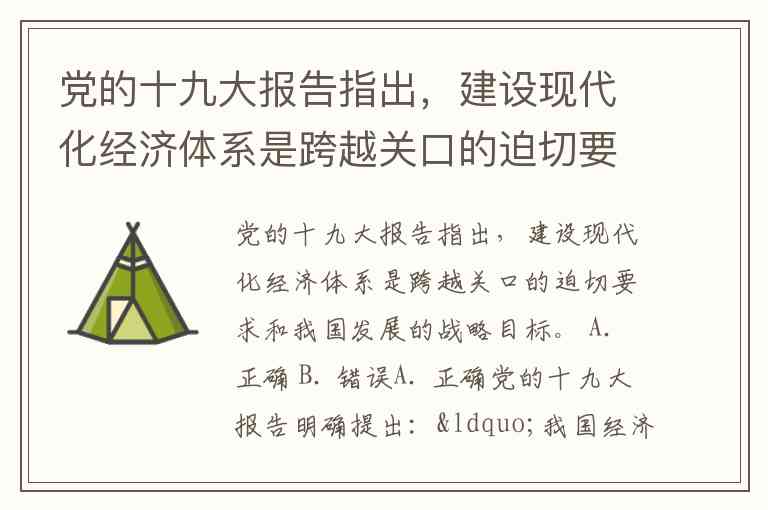 党的十九大报告指出,建设现代化经济体系是跨越关口的迫切要求和我国发展的战略目标。 A. 正确 B. 错误