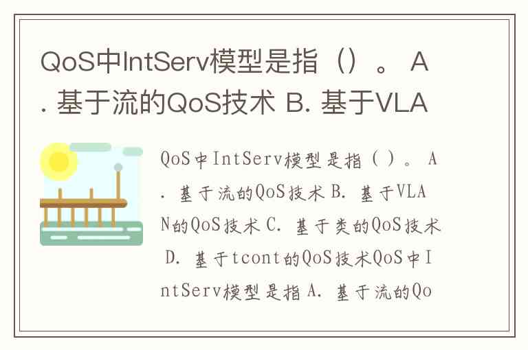 QoS中IntServ模型是指()。 A. 基于流的QoS技术 B. 基于VLAN的QoS技术 C. 基于类的QoS技术 D. 基于tcont的QoS技术
