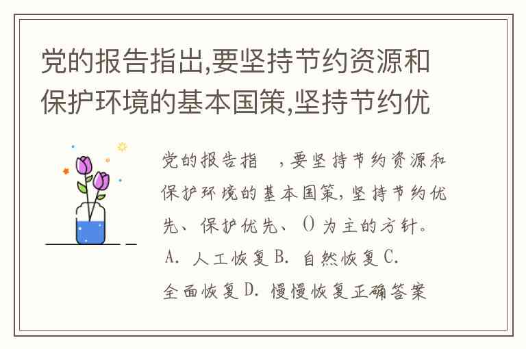 党的报告指岀,要坚持节约资源和保护环境的基本国策,坚持节约优先、保护优先、()为主的方针。 A. 人工恢复 B. 自然恢复 C. 全面恢复 D. 慢慢恢复