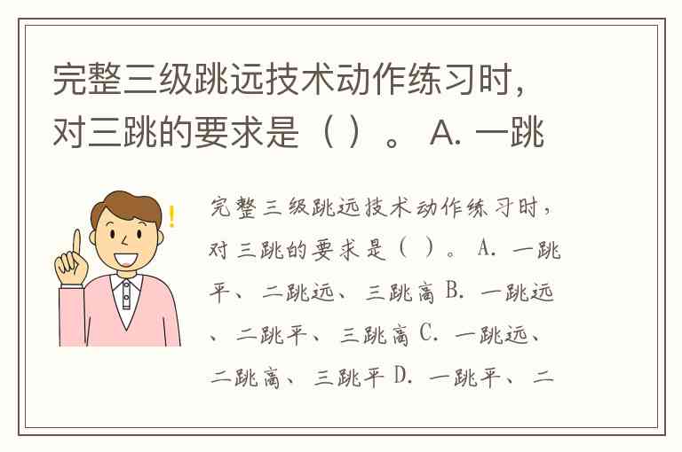 完整三级跳远技术动作练习时,对三跳的要求是( )。 A. 一跳平、二跳远、三跳高 B. 一跳远、二跳平、三跳高 C. 一跳远、二跳高、三跳平 D. 一跳平、二跳高、三跳远
