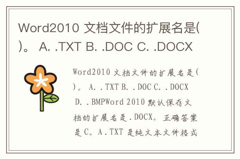 Word2010 文档文件的扩展名是()。 A. .TXT B. .DOC C. .DOCX D. .BMP