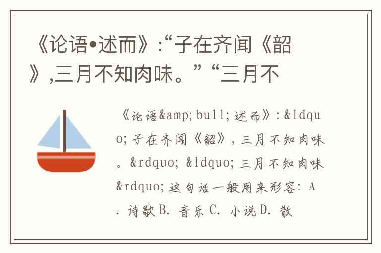 《论语•述而》:“子在齐闻《韶》,三月不知肉味。” “三月不知肉味”这句话一般用来形容: A. 诗歌 B. 音乐 C. 小说 D. 散文