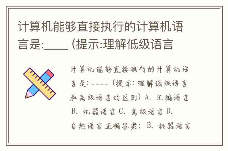 计算机能够直接执行的计算机语言是:____ (提示:理解低级语言和高级语言的区别) A. 汇编语言 B. 机器语言 C. 高级语言 D. 自然语言