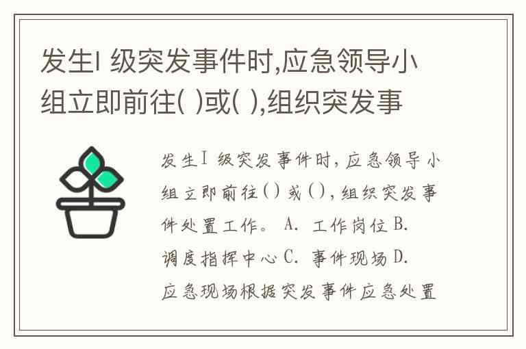发生I 级突发事件时,应急领导小组立即前往( )或( ),组织突发事件处置工作。 A. 工作岗位 B. 调度指挥中心 C. 事件现场 D. 应急现场