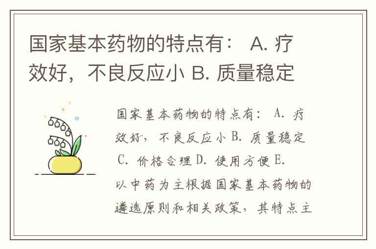国家基本药物的特点有: A. 疗效好,不良反应小 B. 质量稳定 C. 价格合理 D. 使用方便 E. 以中药为主