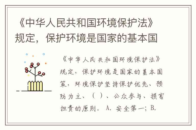 《中华人民共和国环境保护法》规定,保护环境是国家的基本国策,环境保护坚持保护优先、预防为主、( )、公众参与、损害担责的原则。 A. 安全第一; B. 综合治理; C. 人民至上; D. 全员参与;