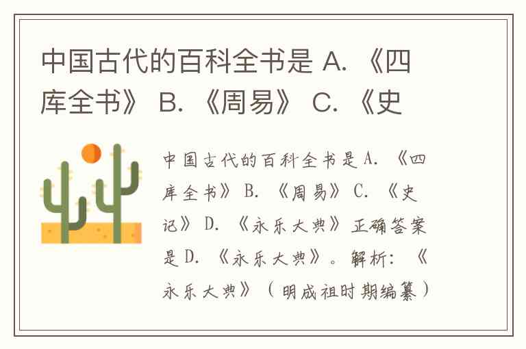 中国古代的百科全书是 A. 《四库全书》 B. 《周易》 C. 《史记》 D. 《永乐大典》