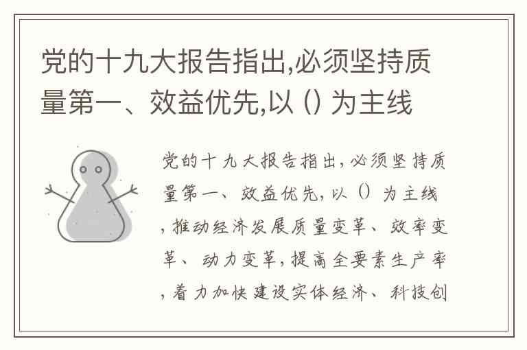 党的十九大报告指出,必须坚持质量第一、效益优先,以 供给侧结构性改革 为主线,推动经济发展质量变革、效率变革、动力变革,提高全要素生产率,着力加快建设实体经济、科技创新、现代金融、人力资源协同发展的产业体系,着力构建市场机制有效、微观主体有活力、宏观调控有度的经济体制,不断增强我国经济创新力和竞争力。