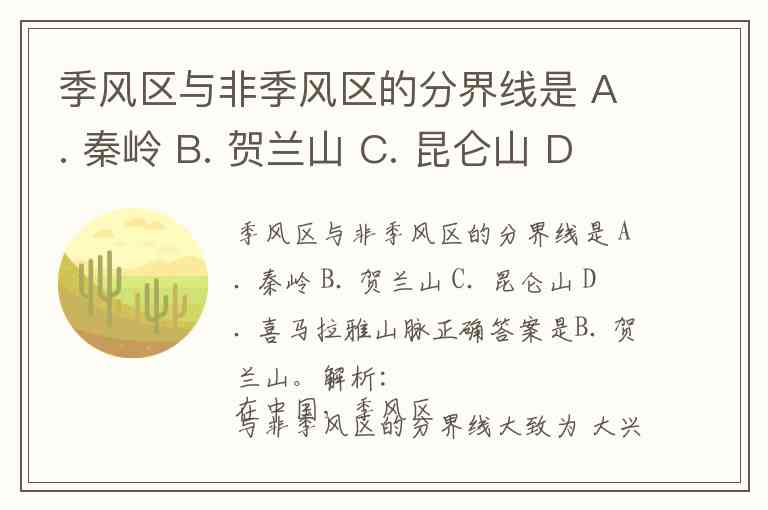 季风区与非季风区的分界线是 A. 秦岭 B. 贺兰山 C. 昆仑山 D. 喜马拉雅山脉
