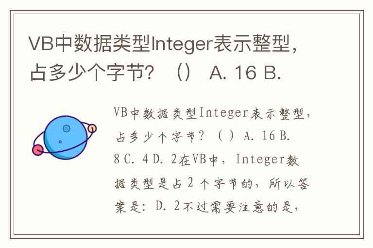 VB中数据类型Integer表示整型,占多少个字节?() A. 16 B. 8 C. 4 D. 2