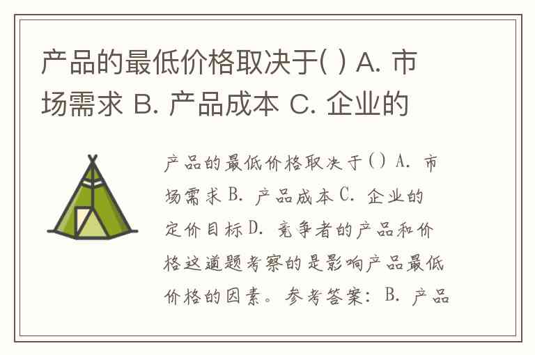 产品的最低价格取决于( ) A. 市场需求 B. 产品成本 C. 企业的定价目标 D. 竞争者的产品和价格
