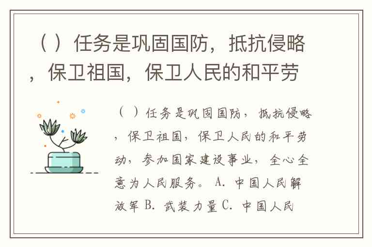 ( )任务是巩固国防,抵抗侵略,保卫祖国,保卫人民的和平劳动,参加国家建设事业,全心全意为人民服务。 A. 中国人民解放军 B. 武装力量 C. 中国人民武装警察部队 D. 民兵