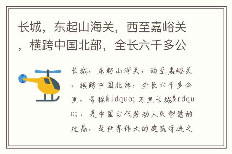 长城,东起山海关,西至嘉峪关,绵延六千多公里,横贯中国北方,素有“万里长城”之称。它是中国古代劳动人民智慧的杰出代表,被列为世界建筑史上的奇迹之一。