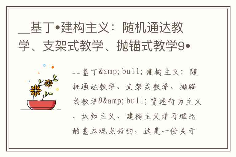 __基丁•建构主义:随机通达教学、支架式教学、抛锚式教学9•简述行为主义、认知主义、建构主义学习理论的基本观点