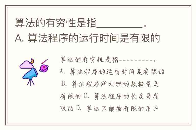 算法的有穷性是指_________。 A. 算法程序的运行时间是有限的 B. 算法程序所处理的数据量是有限的 C. 算法程序的长度是有限的 D. 算法只能被有限的用户使用