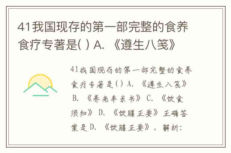 41我国现存的第一部完整的食养食疗专著是( ) A. 《遵生八笺》 B. 《养老奉亲书》 C. 《饮食须知》 D. 《饮膳正要》