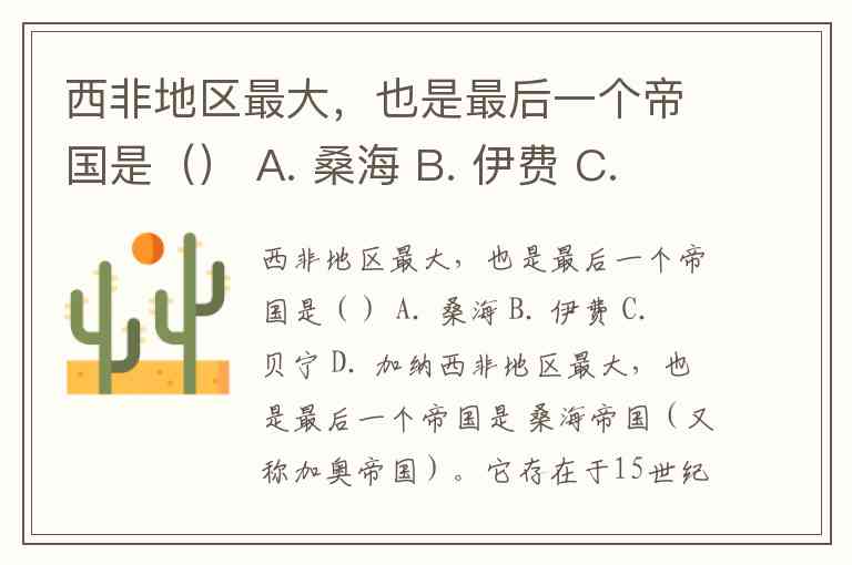 西非地区最大,也是最后一个帝国是() A. 桑海 B. 伊费 C. 贝宁 D. 加纳
