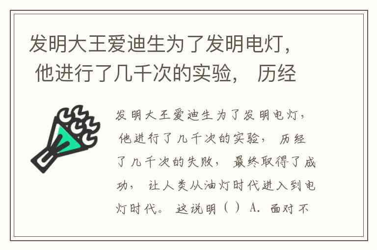 发明大王爱迪生为了发明电灯, 他进行了几千次的实验, 历经了几千次的失败, 最终取得了成功, 让人类从油灯时代进入到电灯时代。 这说明() A. 面对不同的挫折, 不同的人会有不同的 B. 挫折会让我们感到失落、 难过、 愤怒、 不满 C. 主动向他人求助有利于增强我们的生命力量 D. 人生难免有挫折, 只有勇敢面对, 才能取得成功