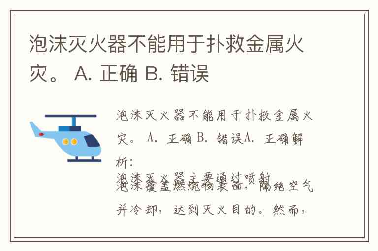 泡沫灭火器不能用于扑救金属火灾。 A. 正确 B. 错误
