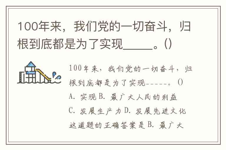 100年来,我们党的一切奋斗,归根到底都是为了实现_____。() A. 实现 B. 最广大人民的利益 C. 发展生产力 D. 发展先进文化