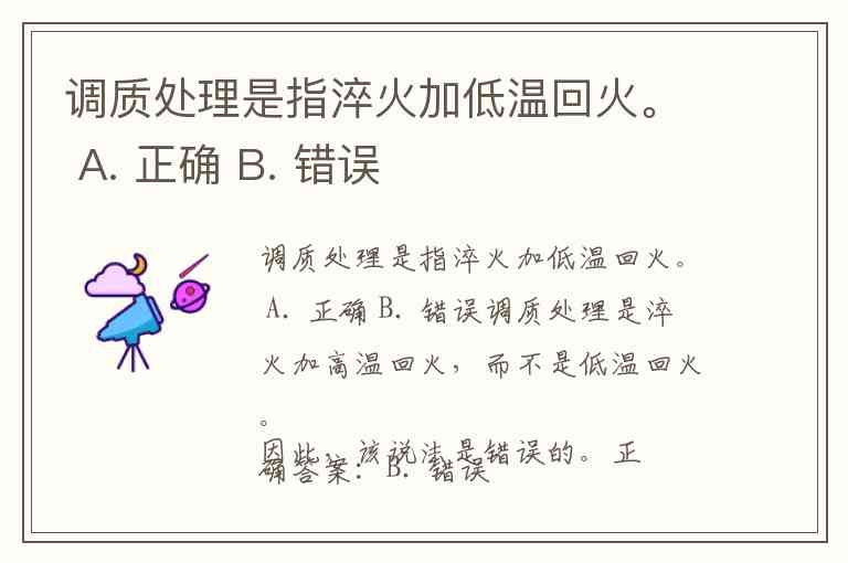 调质处理是指淬火加低温回火。 A. 正确 B. 错误