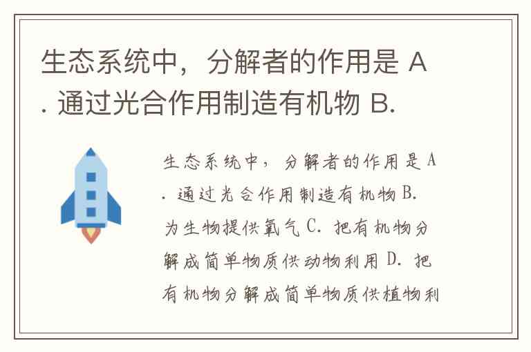 生态系统中,分解者的作用是 A. 通过光合作用制造有机物 B. 为生物提供氧气 C. 把有机物分解成简单物质供动物利用 D. 把有机物分解成简单物质供植物利用