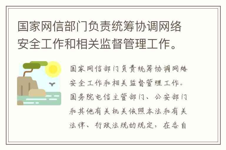 国家网信部门负责统筹协调网络安全工作和相关监督管理工作。国务院电信主管部门、公安部门和其他有关机关依照本法和有关法律、行政法规的规定,在各自职责范围内负责()和监督管理工作。A 网络安全B.设备安全C.信息安全D.网络安全保护 A. 网络安全 B. .设备安全 C. .信息安全 D. .网络安全保护