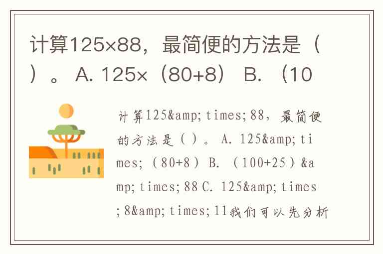 计算125×88,最简便的方法是()。 A. 125×(80+8) B. (100+25)×88 C. 125×8×11