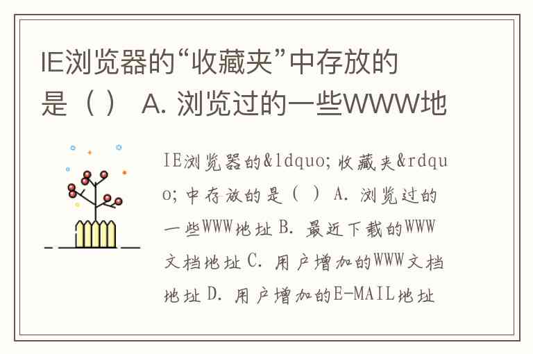 IE浏览器的“收藏夹”中存放的是( ) A. 浏览过的一些WWW地址 B. 最近下载的WWW文档地址 C. 用户增加的WWW文档地址 D. 用户增加的E-MAIL地址