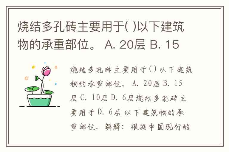 烧结多孔砖主要用于( )以下建筑物的承重部位。 A. 20层 B. 15层 C. 10层 D. 6层