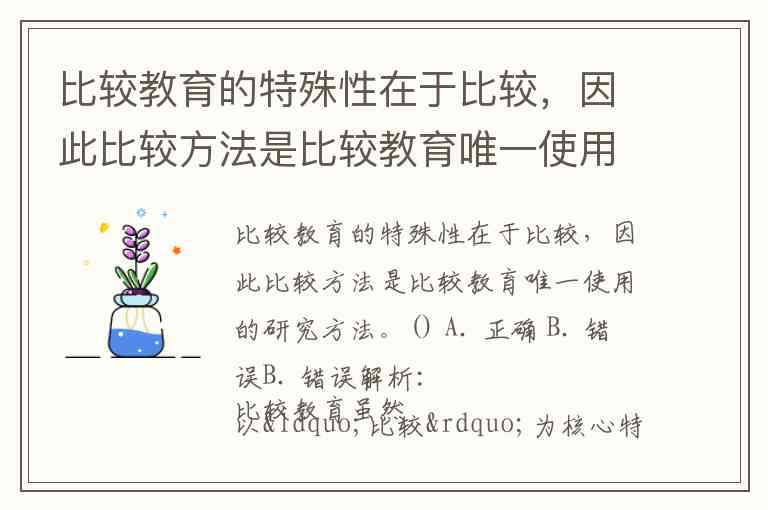 比较教育的特殊性在于比较,因此比较方法是比较教育唯一使用的研究方法。() A. 正确 B. 错误