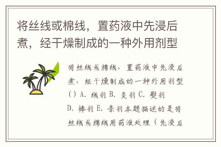 将丝线或棉线,置药液中先浸后煮,经干燥制成的一种外用剂型( ) A. 线剂 B. 灸剂 C. 熨剂 D. 棒剂 E. 条剂