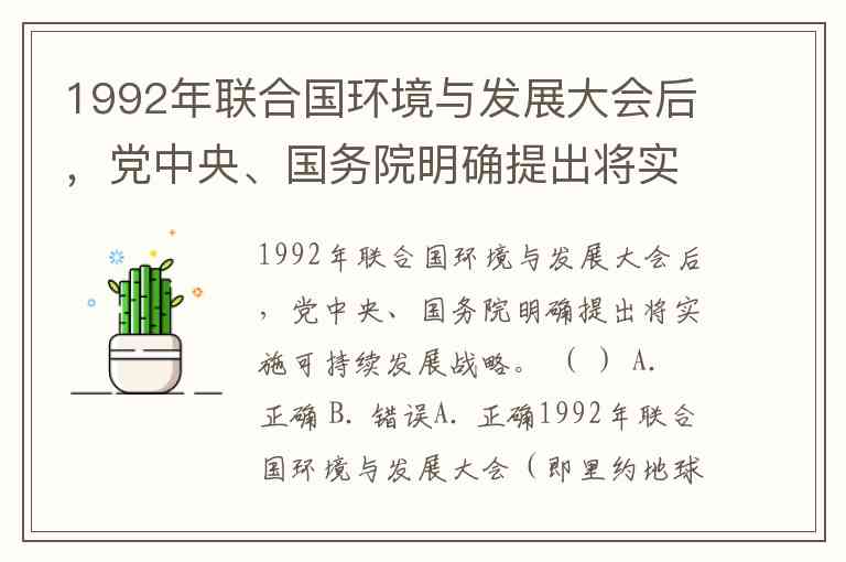 1992年联合国环境与发展大会后,党中央、国务院明确提出将实施可持续发展战略。 ( ) A. 正确 B. 错误