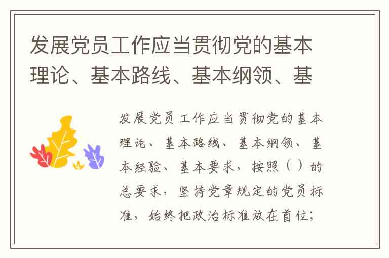 发展党员工作应当贯彻党的基本理论、基本路线、基本纲领、基本经验、基本要求,按照控制总量、优化结构、提高质量、发挥作用的总要求,坚持党章规定的党员标准,始终把政治标准放在首位;坚持慎重发展、均衡发展,有领导、有计划地进行;坚持入党自愿原则和个别吸收原则,成熟一个,发展一个。