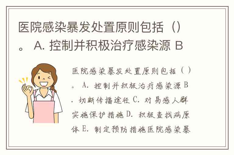 医院感染暴发处置原则包括()。 A. 控制并积极治疗感染源 B. 切断传播途径 C. 对易感人群实施保护措施 D. 积极查找病原体 E. 制定预防措施