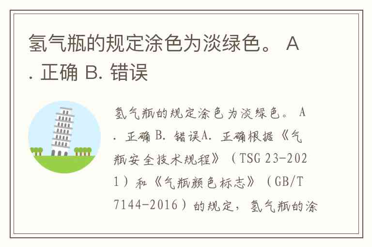 氢气瓶的规定涂色为淡绿色。 A. 正确 B. 错误