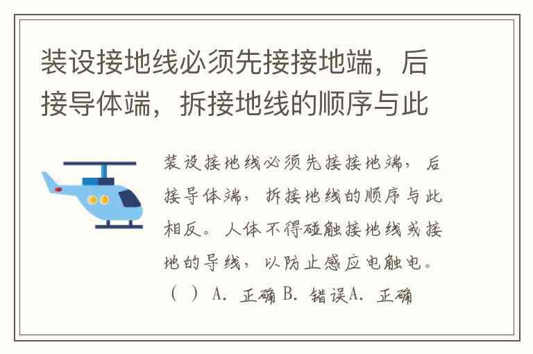 装设接地线顺序:必须先接接地端(即与大地连接的一端),再接导体端(即与停电设备或线路连接的一端),这样可以在接通导体端的瞬间避免剩余电荷或感应电通过人体放电。