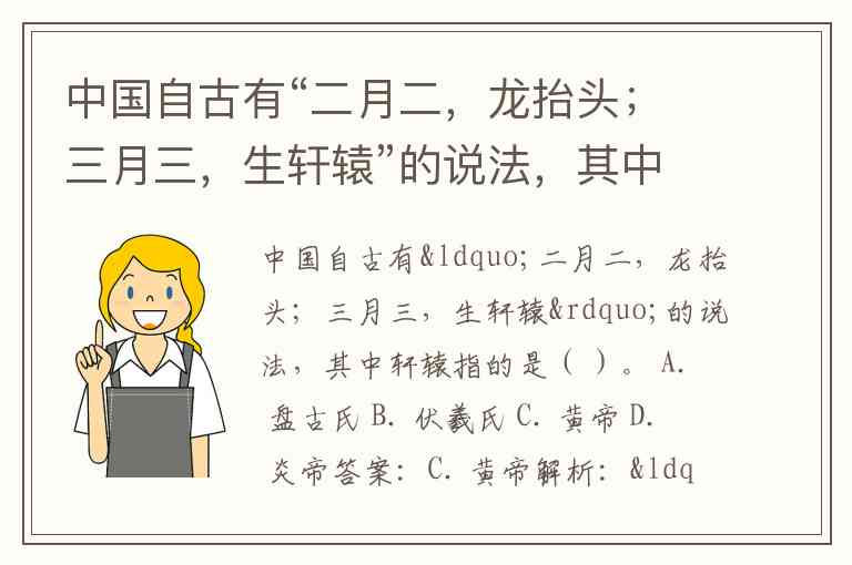 中国自古有“二月二,龙抬头;三月三,生轩辕”的说法,其中轩辕指的是( )。 A. 盘古氏 B. 伏羲氏 C. 黄帝 D. 炎帝