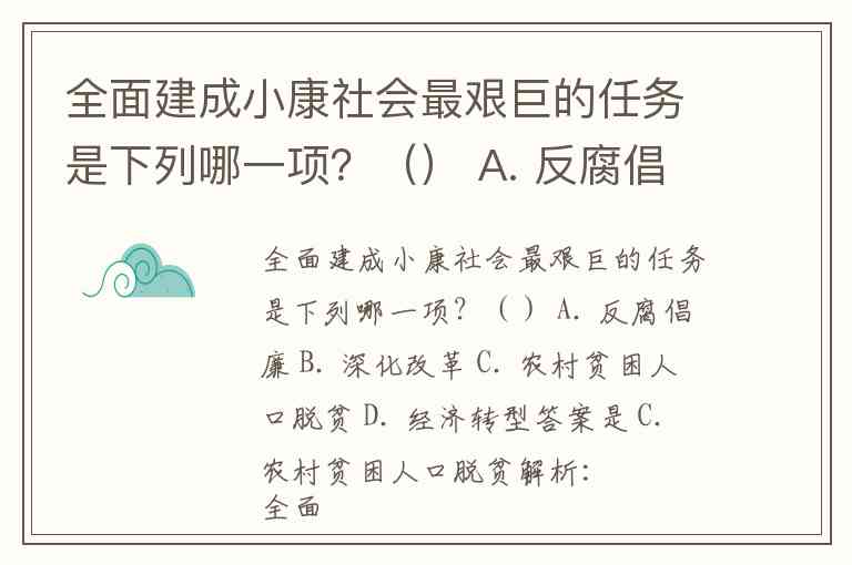 全面建成小康社会最艰巨的任务是下列哪一项?() A. 反腐倡廉 B. 深化改革 C. 农村贫困人口脱贫 D. 经济转型