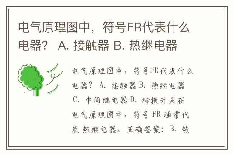 电气原理图中,符号FR代表什么电器? A. 接触器 B. 热继电器 C. 中间继电器 D. 转换开关