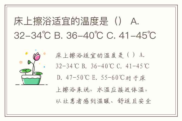 床上擦浴适宜的温度是() A. 32-34℃ B. 36-40℃ C. 41-45℃ D. 47-50℃ E. 55-60℃