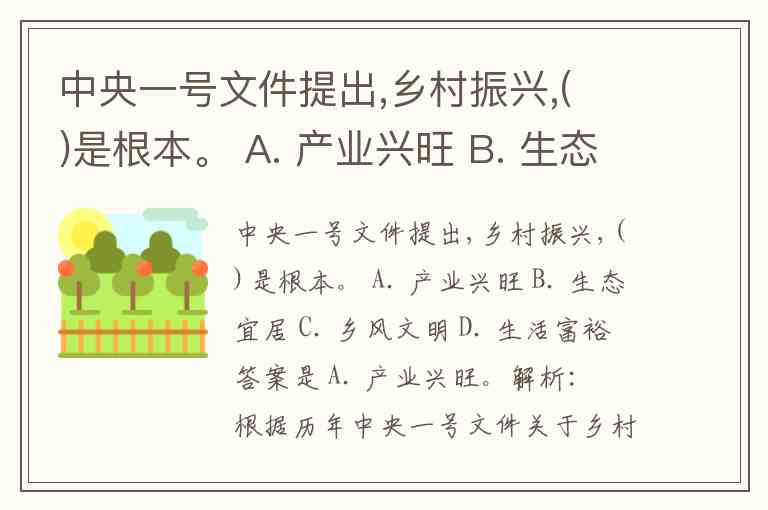 中央一号文件提出,乡村振兴,( )是根本。 A. 产业兴旺 B. 生态宜居 C. 乡风文明 D. 生活富裕